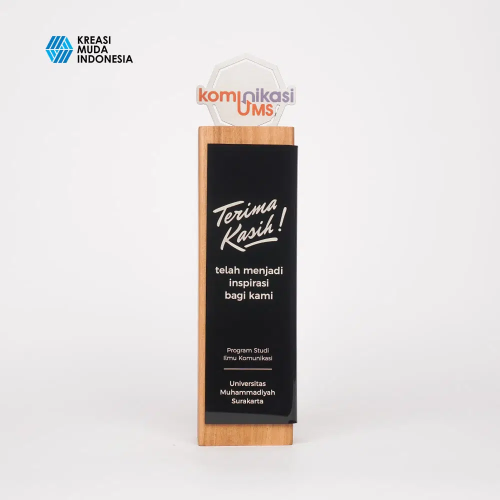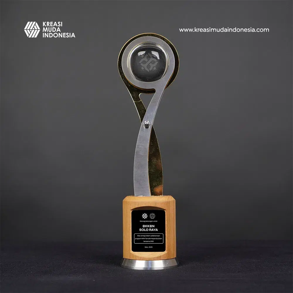 Plakat eksklusif ini dirancang untuk memperingati kolaborasi strategis antara BKKBN Solo Raya dan Universitas Sebelas Maret. Mengusung desain unik dengan bola transparan di bagian atas sebagai simbol visi dan keterbukaan, plakat ini dipadukan dengan struktur lengkung elegan dari material kokoh, serta base kayu jati yang solid dan panel akrilik hitam di bagian depan. Setiap detail dapat dikustomisasi mulai dari logo, teks penghargaan, hingga elemen visual khusus sehingga sangat ideal sebagai bentuk penghargaan kemitraan yang tidak hanya estetis, tetapi juga sarat makna dan penghormatan.
