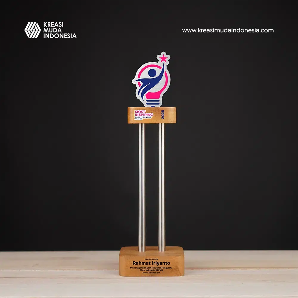 Plakat Award HIPMI 2025 merepresentasikan semangat wirausaha muda yang inovatif dan penuh ide segar. Menggunakan material teak wood dan stainless steel yang diproses dengan teknik precision cutting dan UV Printing, plakat ini menghadirkan detail yang tajam dan berkarakter. Desainnya yang tegak dan ramping menjadi simbol pertumbuhan serta keberanian generasi bisnis muda Indonesia, menjadikannya sangat tepat sebagai plakat penghargaan yang elegan dan penuh makna.