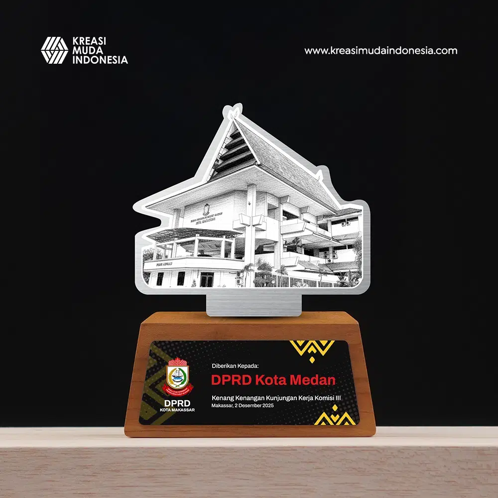 Plakat DPRD Kota Medan adalah plakat representatif yang menampilkan printed visual gedung DPRD pada panel Stainless Steel, dipadukan dengan alas Teak Wood serta plate Black Acrylic untuk identitas kunjungan kerja, menghadirkan kesan formal dan kuat sehingga cocok untuk kunjungan Komisi, agenda protokoler, maupun cinderamata antarinstansi, plakat ini juga ideal sebagai plakat penghargaan kemitraan karena mampu merepresentasikan kerja sama resmi dan profesional antar lembaga pemerintah.