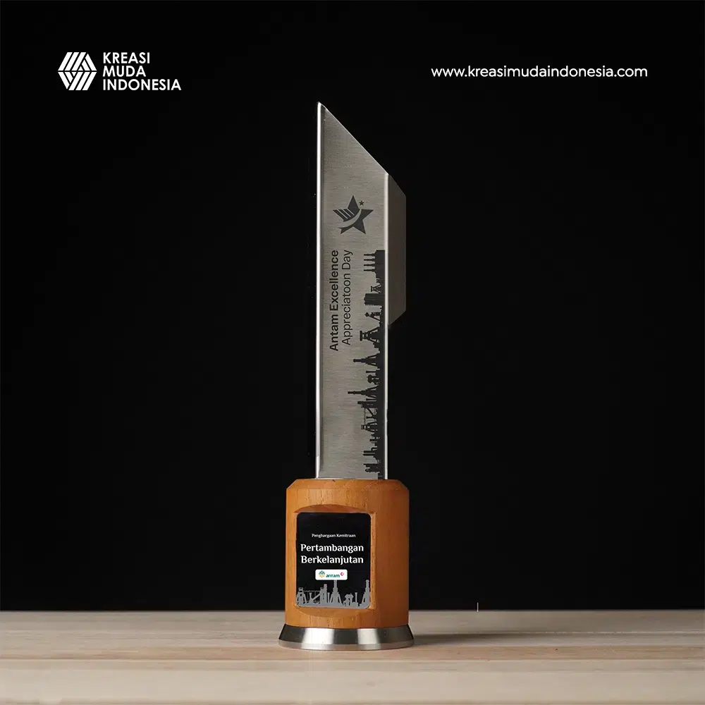Plakat Penghargaan ANTAM Excellence Appreciation Day ini menggunakan kombinasi stainless steel berukir, kayu jati, dan akrilik hitam untuk menghadirkan tampilan modern dan berwibawa. Siluet industri tambang memberikan identitas yang kuat dan relevan untuk acara apresiasi karyawan maupun mitra, dan seluruh kontennya dapat disesuaikan mulai dari nama penerima, divisi, hingga tema penghargaan. Plakat ini juga sangat tepat digunakan sebagai bentuk penghargaan, menjadikannya simbol penghormatan yang elegan dalam setiap program excellence dan keberlanjutan ANTAM.