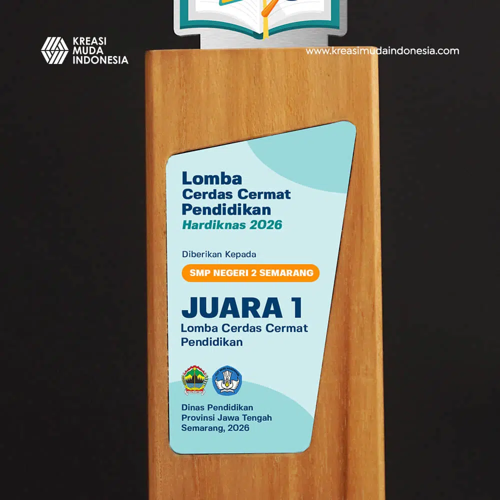 Model Wooden Beam Figure menampilkan desain piala terbaik dengan kombinasi material kayu, stainless steel dan akrilik premium. Tampilan modern dan berkelas menjadikannya cocok untuk kompetisi akademik yang kompetitif.