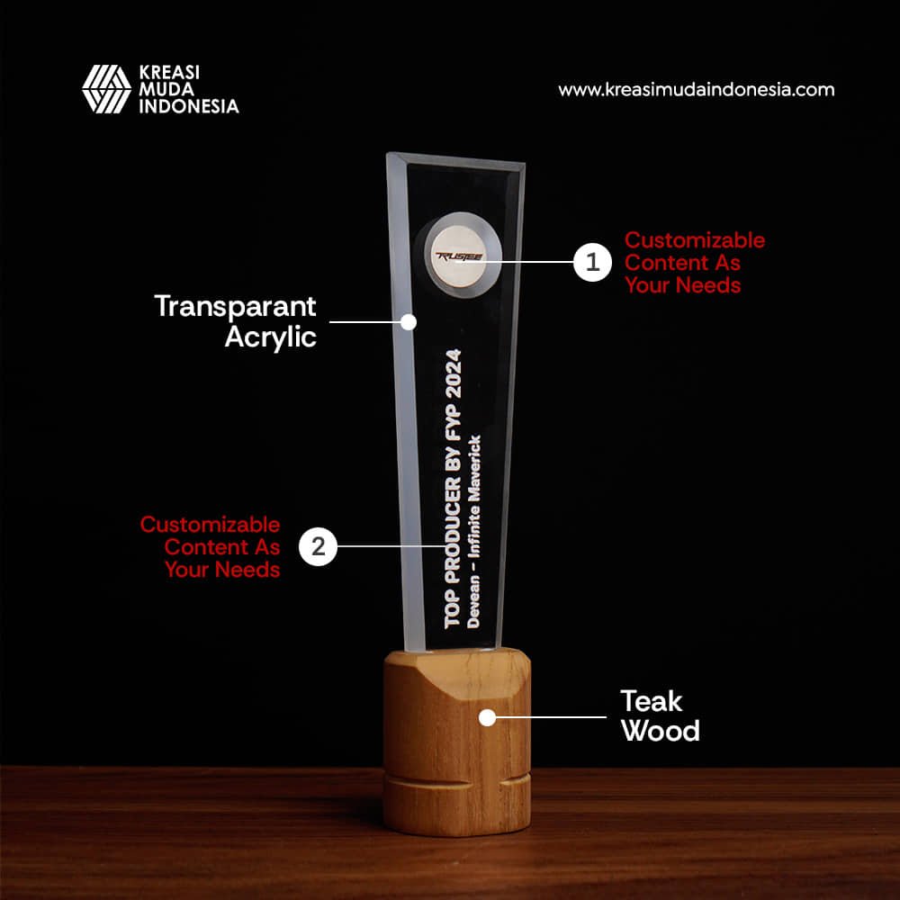 Classy teak wood is used as the base of the plaque which is formed into a cylinder with CNC Milling technology. Then for the main display, acrylic is used which is given UV printing light to form the logo and words of appreciation. This elegant award is suitable for display in an office room or office lobby.