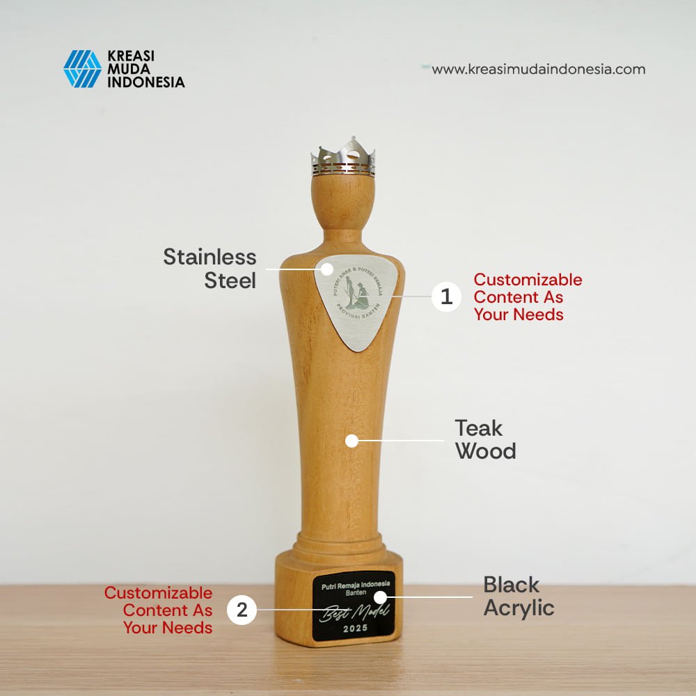 This collection is made from the best teak wood material and combined with acrylic. On the upper acrylic there is a logo and the name of the organizer, while on the bottom is written the name of the organizer, the name of the award, and the year of the award. Formed with a wood milling process, making the Miss Teen Indonesia Trophy look very elegant and graceful.