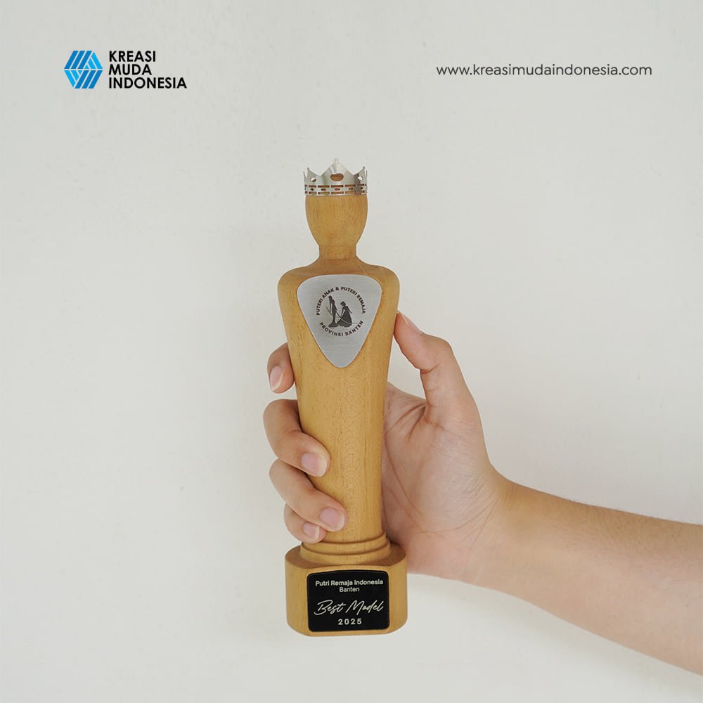The Banten Province Children and Teen Pageant wants to create an award trophy for this year. To make it happen, Kreasi Muda Indonesia designed a trophy with a Wooden Graduate Trophy model that is identical to its toga. However, specifically for this collection, the toga is replaced with a crown figure as the identity of the beauty pageant.
