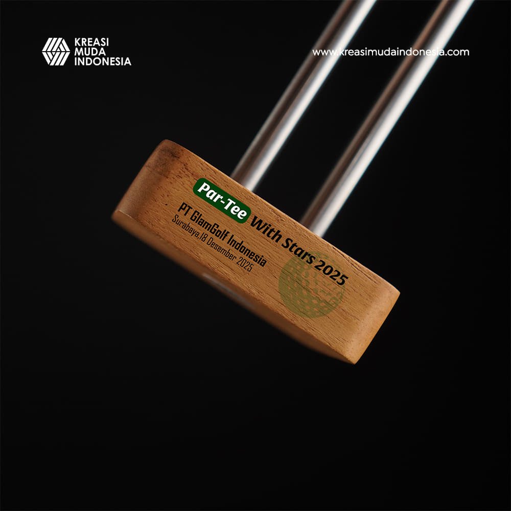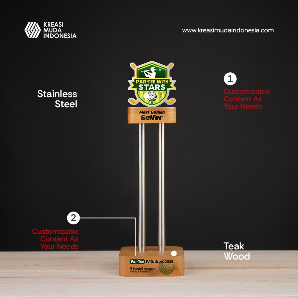 Crafted in the Wooden Metal Pipe Figure model, this trophy combines a solid teak wood base with stainless-steel pipe elements and a dynamic figure that symbolizes motion, strength, and achievement. Event details such as the tournament logo, winner’s name, and award category are precisely engraved and printed using laser cutting and UV printing technology, creating a premium and modern appearance. Its elegant design makes it an ideal choice for corporate, community, or national golf events.
