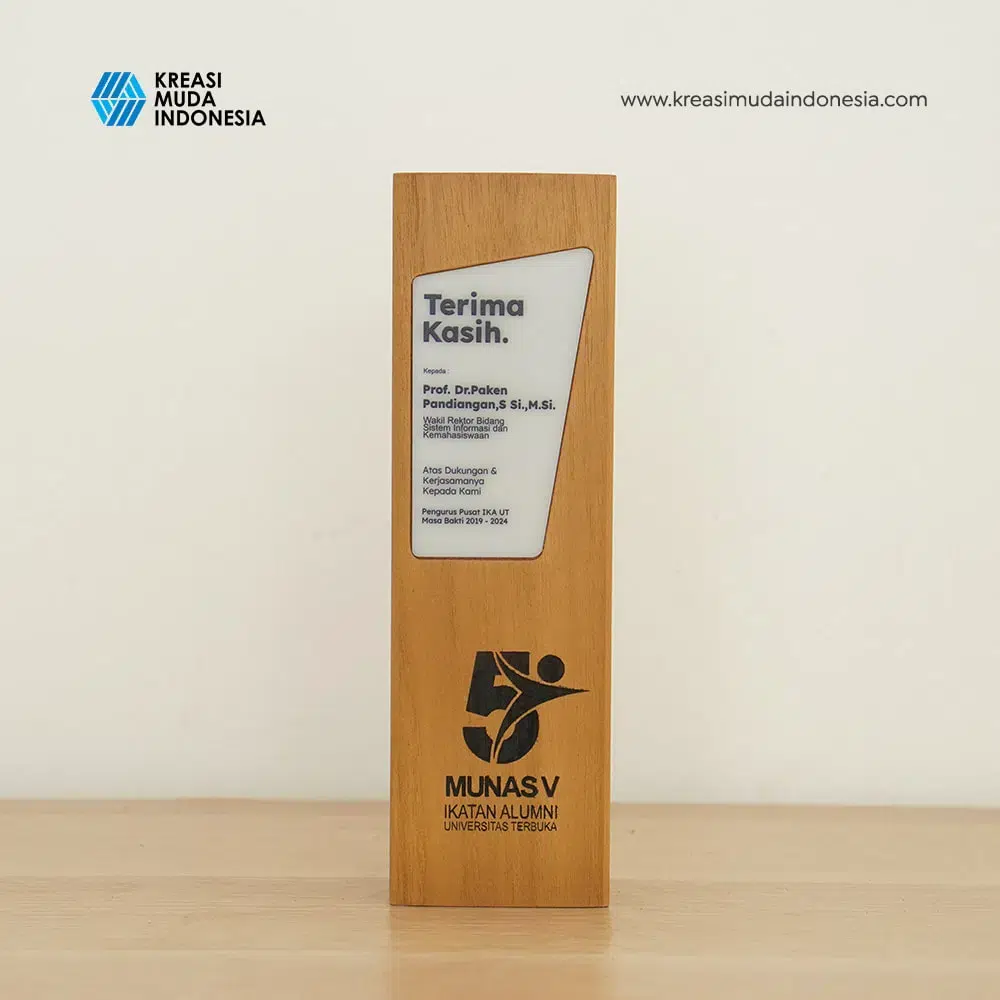 Plaque for the 5th National Congress of Universitas Terbuka is also combined with white acrylic on which is written a thank you-note, the name of the recipient, and the organizer of the event. The writing on this acrylic is neat and precise because it is made with laser marking. This Wooden Beam is expected to increase the closeness of the relationship with IKA UT, and is also proudly displayed by the recipient because it is made from the best materials.