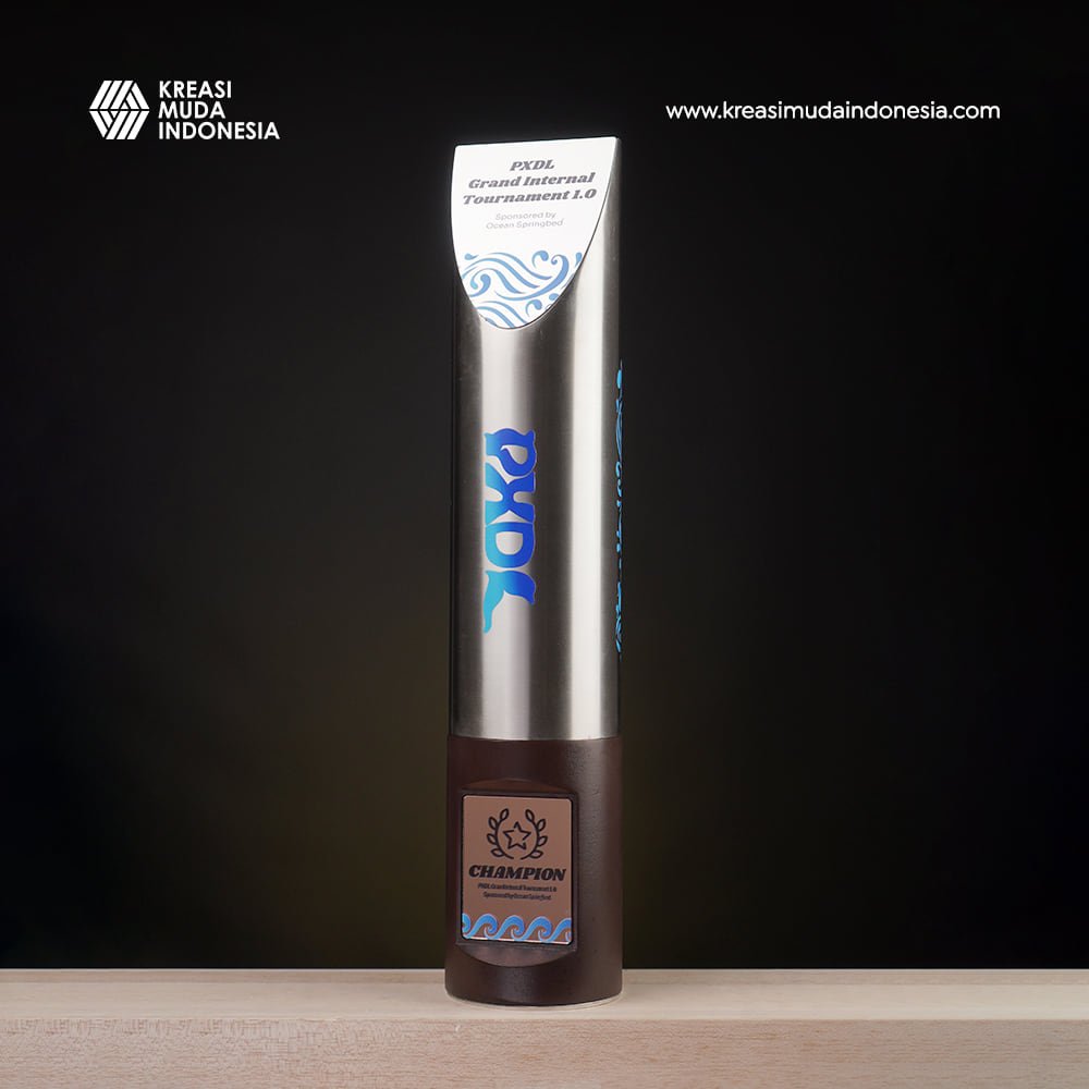 Featuring a tall cylindrical structure with elegant proportions, the trophy presents a modern and bold visual identity. Its design combines refined stainless steel with a sturdy wooden base, resulting in a premium balance of natural and industrial aesthetics. The trophy can also be customized with logos, text, or event identities, making it a more personal and meaningful award.