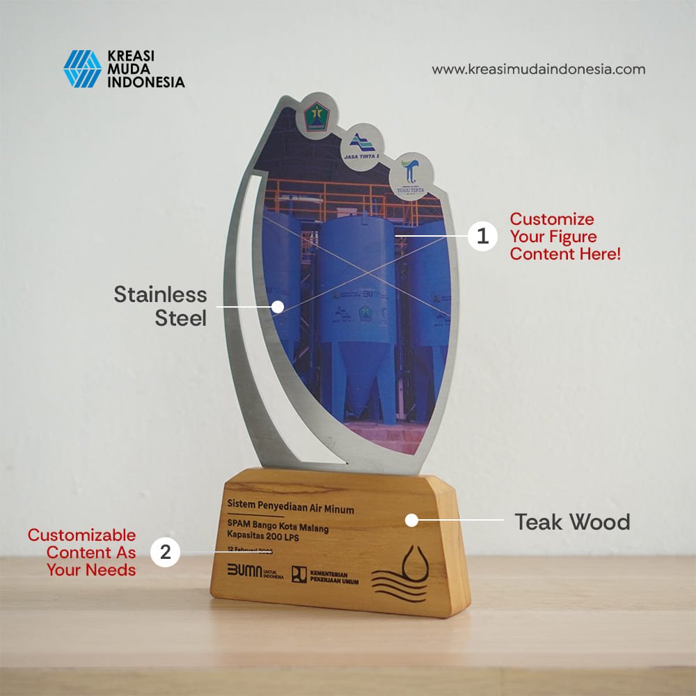 SPAM Bango Plaque – Malang City is a symbol of appreciation for the achievement of a vital project that supports the basic needs of the community, namely clean water. This plaque is a combination of teak wood as the base and premium stainless steel. Stainless steel as the main material is formed using a laser cutting machine. This material is also irradiated with UV printing to print images and logos of the institutions.