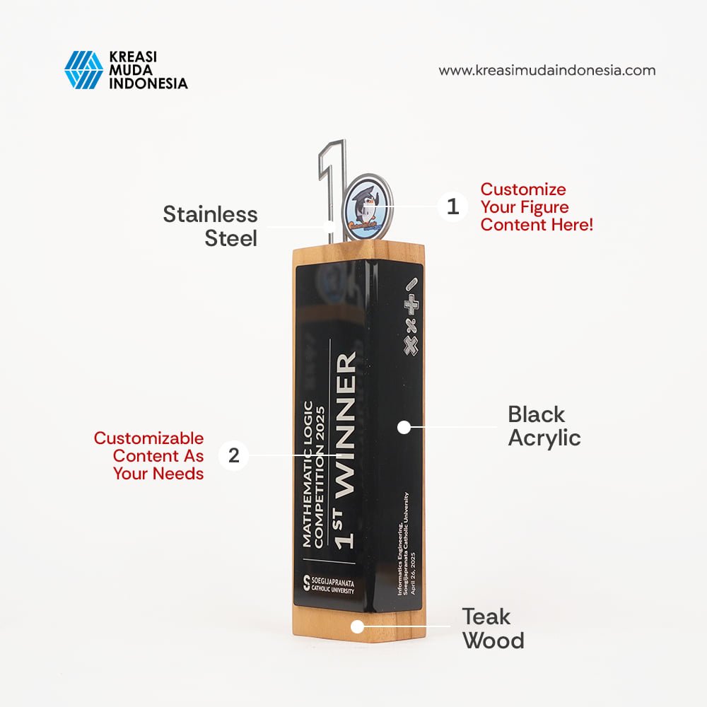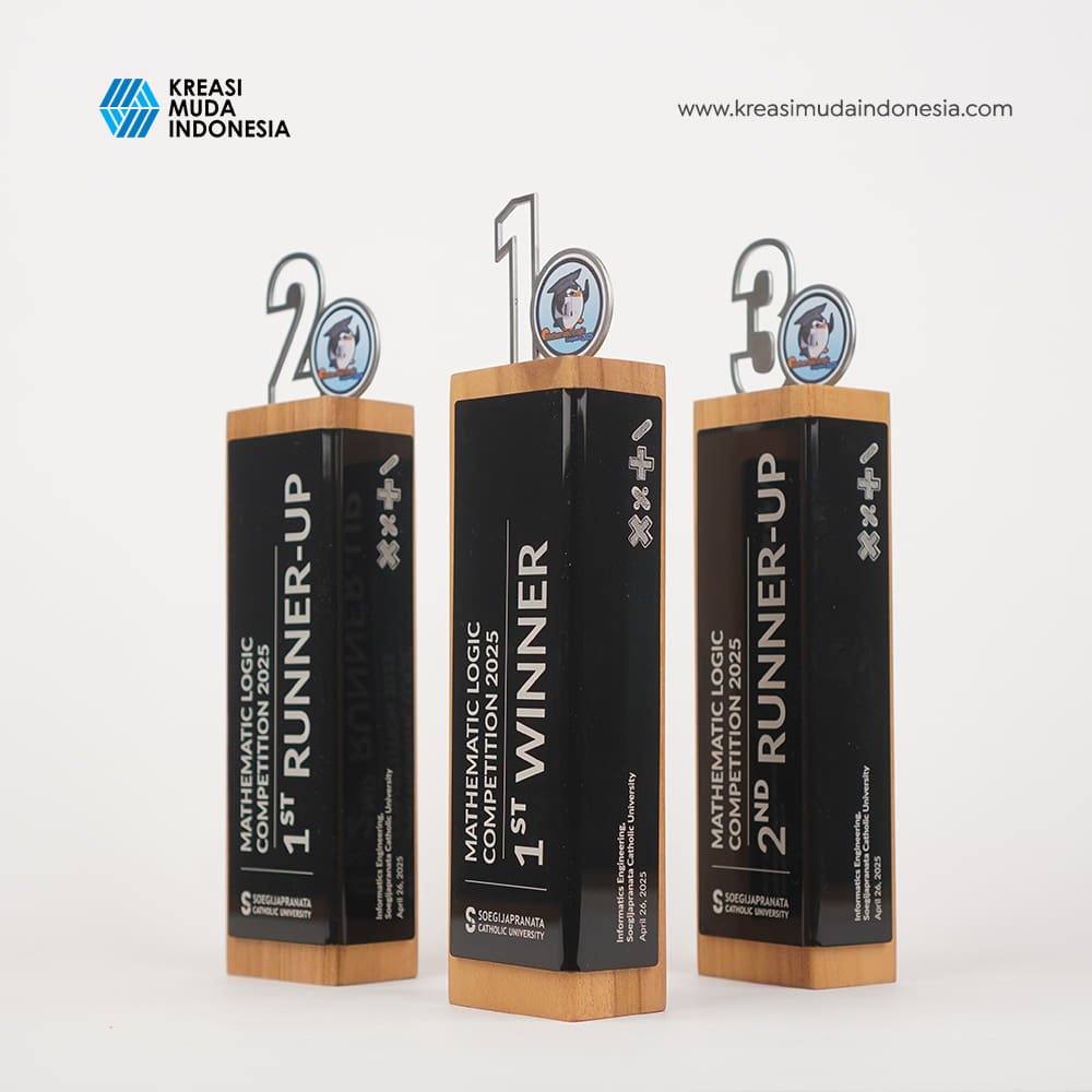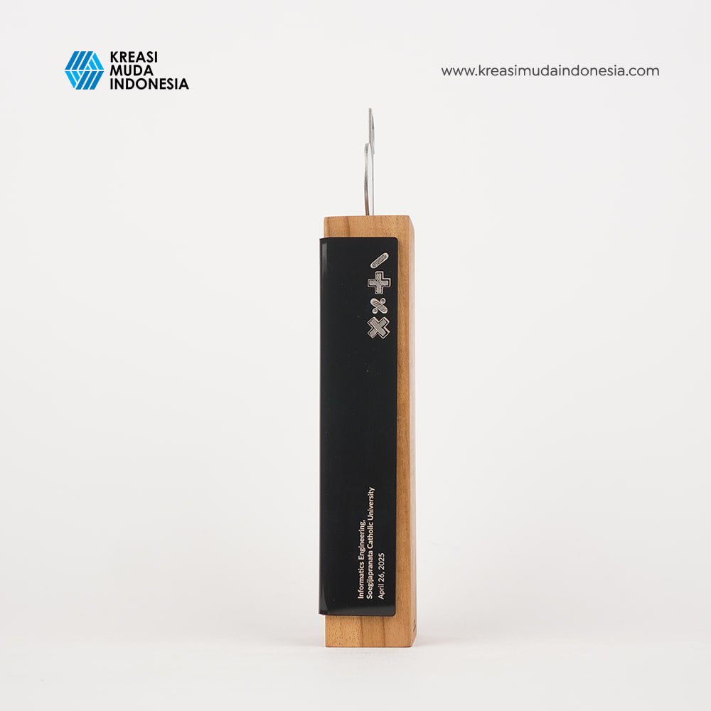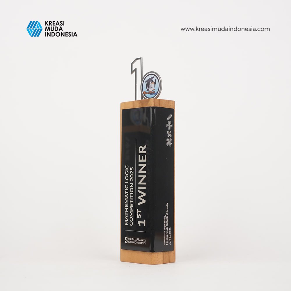 To appreciate the first place winner of the 2025 Mathematics Logic Competition, UNIKA Semarang and Kreasi Muda Indonesia designed the best award. The Mathematics Competition Trophy of UNIKA Semarang is made to resemble the Wooden Wrapped Figure collection. This collection uses teak wood coated with acrylic. This competition trophy utilizes laser marking technology to form the writing on it.