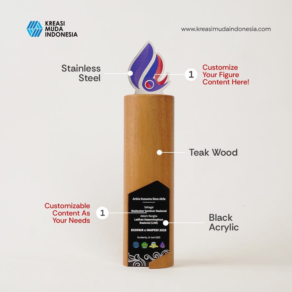 Made from teak wood for the base, combined with stainless steel for the figure. The text is made of acrylic. It is processed using UV printing and laser cutting machines, resulting in an elegant plaque. We offer various design options for appreciation plaques.