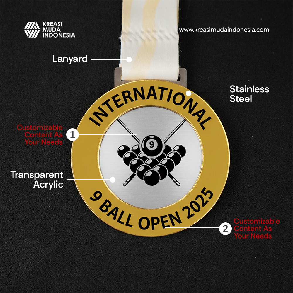 Made from high-grade stainless steel with elegant gold acrylic accents, this medal showcases an iconic 9-ball illustration. Laser-cut precision and UV-printed detailing ensure a sharp and refined finish suitable for international billiard events.