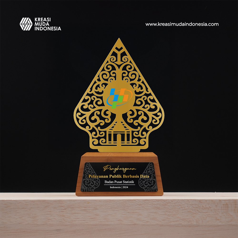 Plakat Gunungan Pelayanan Publik 2026 dirancang sebagai simbol apresiasi resmi untuk institusi pelayanan publik, menampilkan figur gunungan stainless steel cutting dengan detail ornamen elegan, dipadukan panel akrilik cetak pada bagian dasar sebagai informasi penghargaan. Seluruh konten dapat disesuaikan dengan identitas instansi, program, dan tahun penilaian.